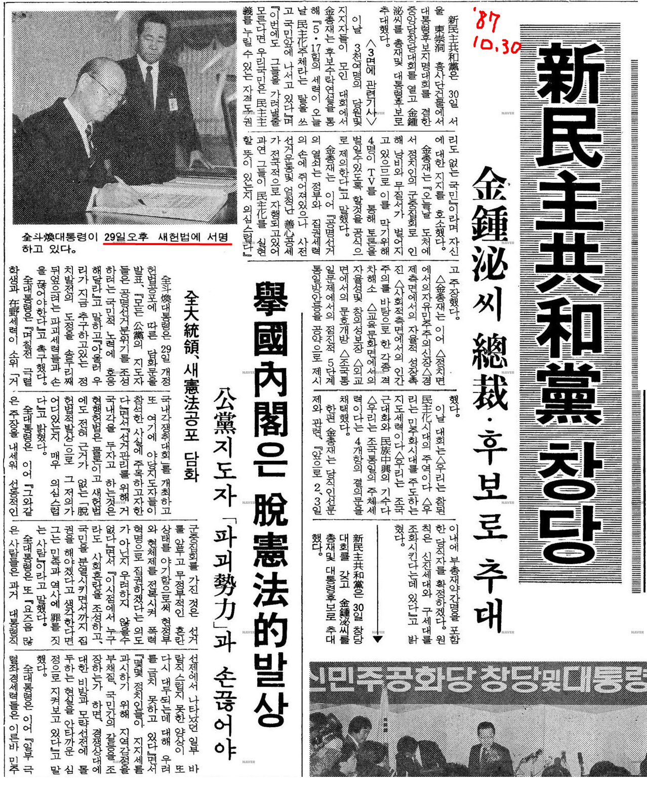 1987년 10월 29일에 국민투표로 통과된 '새 헌법 (현재 6공화국 헌법)'에 서명하고 있는 게 이채롭다.