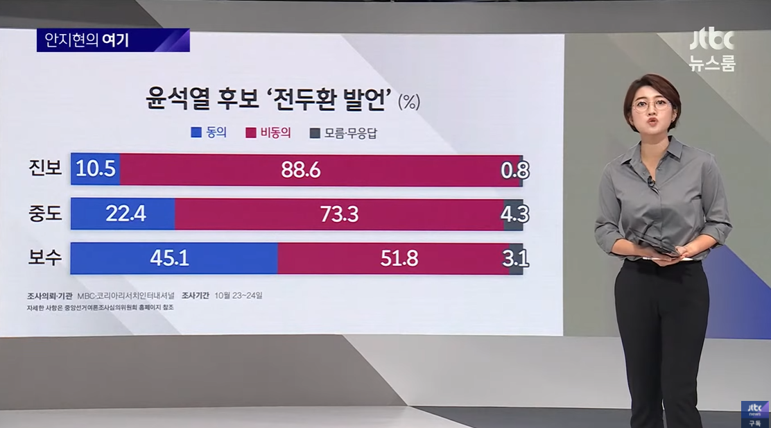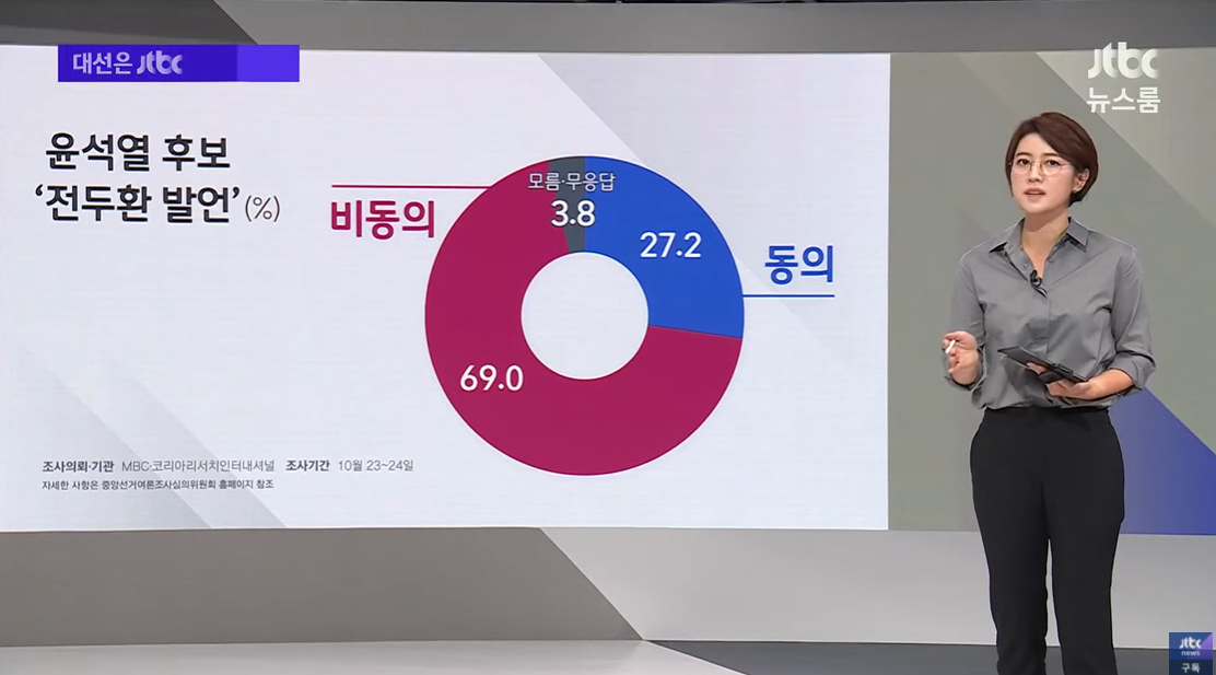 MBC-코리아 리서치 조사 보시면, "윤석열 후보의 전두환 발언에 동의 못한다"는 답변이 69%로 70% 가까이 나왔고, "동의한다"는 의견은 27.2%에 그쳤습니다.