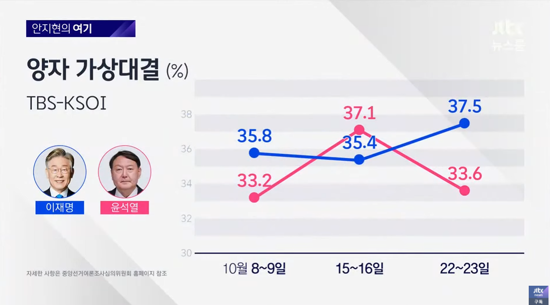 먼저 TBS가 의뢰한 KSOI 여론조사, 이재명과 윤석열 양자대결 추이에서 보시는 것처럼 윤 후보 지지율 상승하다가, 논란 후인 이번 주들어 오차범위 내지만, 3.5%p 감소했습니다.