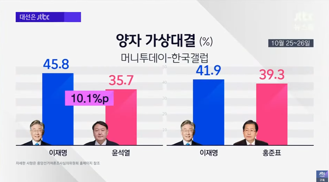 반면 홍 후보의 경우엔, 이재명 후보와의 양자대결에선 오차범위 내 접전 양상입니다.