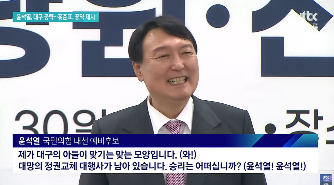 윤석열 : 정말 쉬운 일은 아니었지만, TK(대구·경북) 정치인과 당원 여러분들이 물불 안 가리고 지지해 주고 격려해 줘 앞을 향해 뚜벅뚜벅 갈 수 있었다