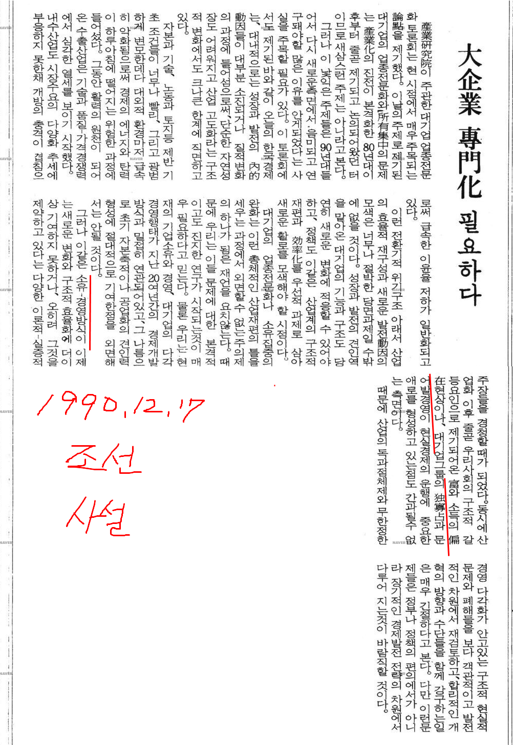대기업 (업종)전문화 필요하다 – 조선일보 사설 -1990년 12월 17일.