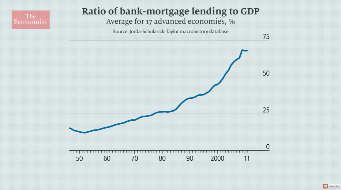 OECD 국가들 대부분이 GDP 에서 주택융자 비율이 차지하는 비중이, 1980년대까지만 해도 25%에 머물렀으나, 1990년 이후, 주택 시장에서 규제 철폐와 신자유주의 정책의 강화로 인해, 주택가격이 폭등했다. 그 결과 2011년의 경우 주택융자가 GDP에서 차지하는 비중이 70%에 육박했다.