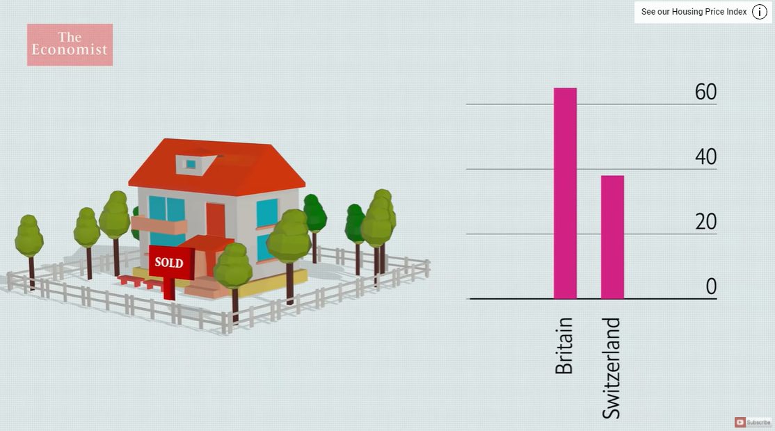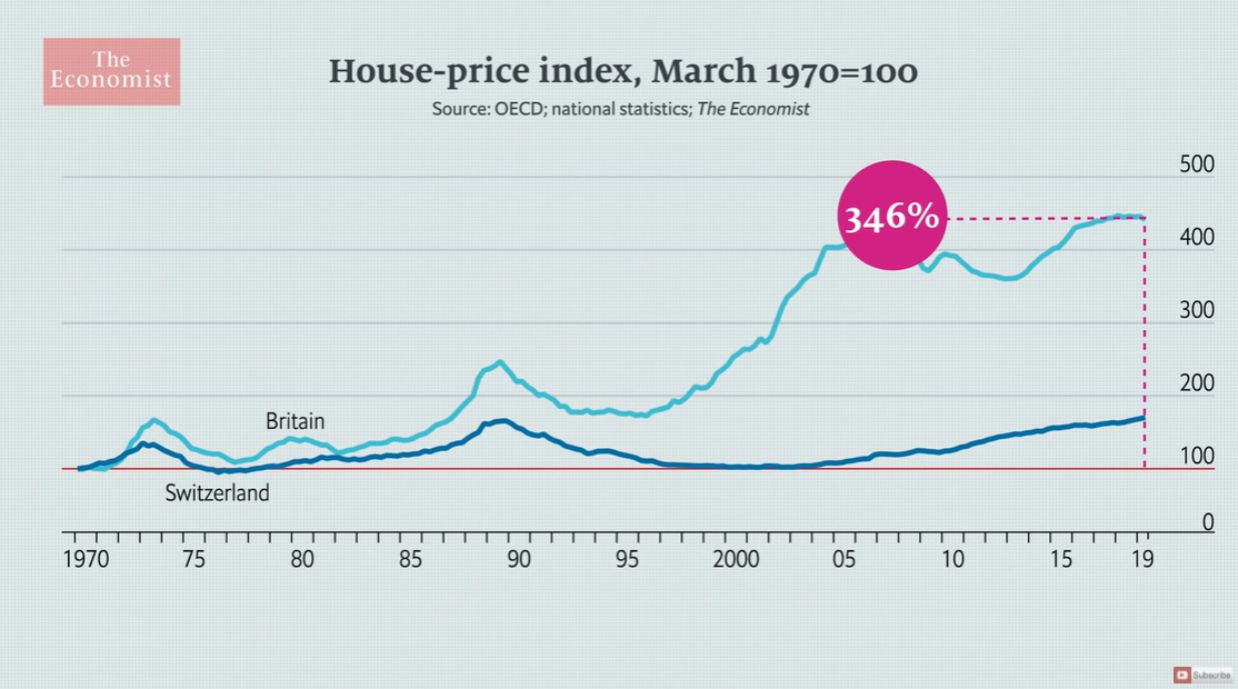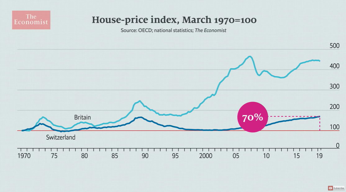 주택 가격 1970년부터 2019년까지, 영국과 스위스의 비교. 영국과 스위스는 1970년대와 1980년대 중반까지는 주택 가격 상승폭이 거의 없었다. 1970년을 100이라고 했을 때, 2019년 현재 영국은 450로 346%나 상승했고, 스위스는 170~180 정도 올라, 70%정도 상승했다. 영국은 지난 2000년 이후 폭등했고, 스위스도 영향을 받긴 했지만, 상승폭은 적은 편이다.