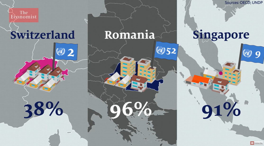 자가 소유율 비교. 스위스는 38%, 루마니아 96%, 싱가포르는 91%이다.