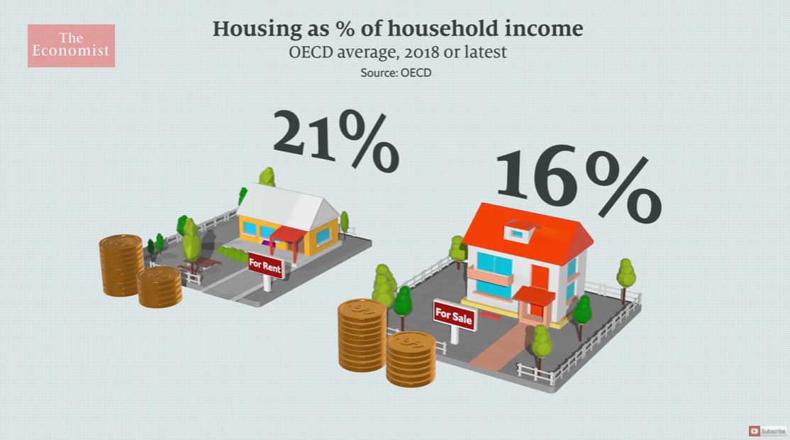 2018년 현재, OECD 통계에 따르면, 가구 소득에서 주택이 차지하는 부담율. 월세의 경우 21%, 자기소유의 16%이다.
