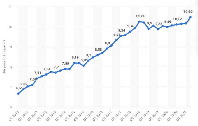 2012년부터 최근까지 베를린의 1㎡당 월세 추이. 9년 동안 월세가 2배 가까이 상승했다.(출처=statista 웹페이지 갈무리)
