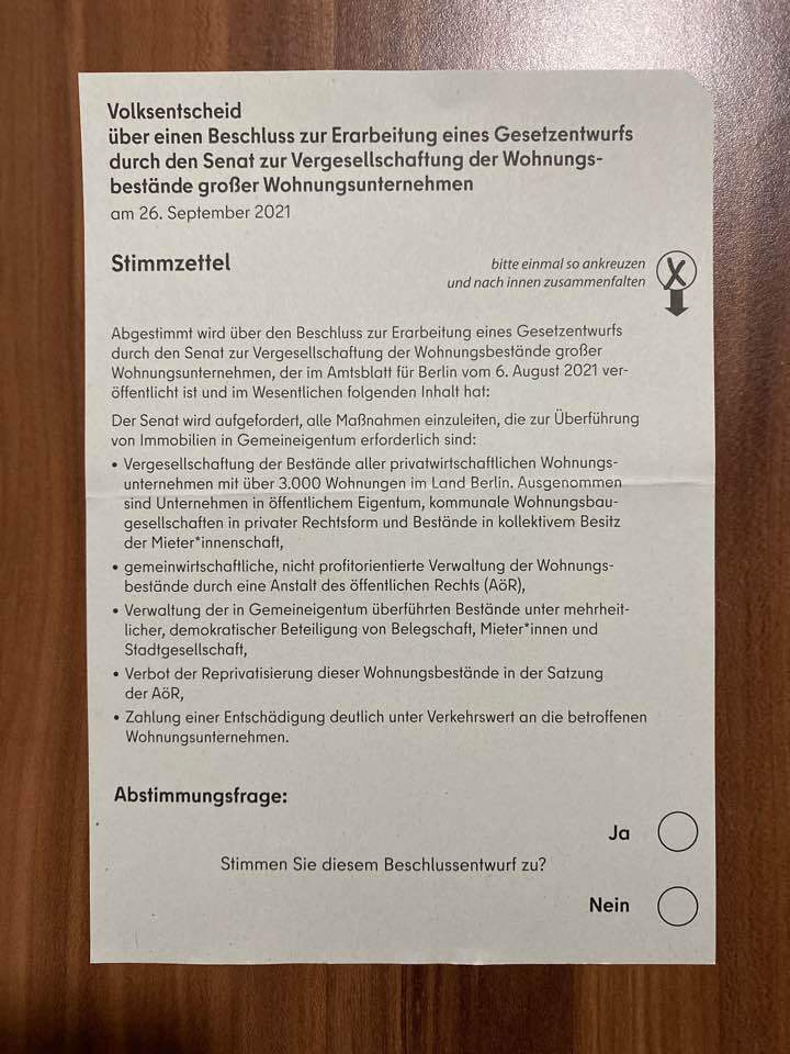 9월 26일 치러진 베를린 주민투표 찬반 투표지.