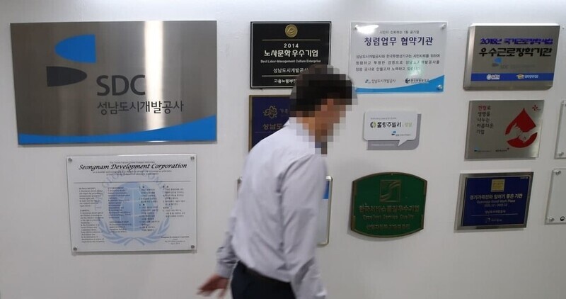 성남도시개발공사 현판 앞으로 공사의 한 관계자가 지나가고 있다. 연합뉴스