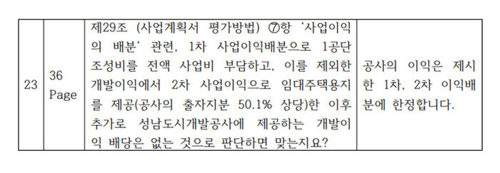 성남도시개발공사가 대장동 개발 관련 민간사업자들의 질의에 응답한 질의회신 문서 일부. ※ 이미지를 누르면 크게 볼 수 있습니다.