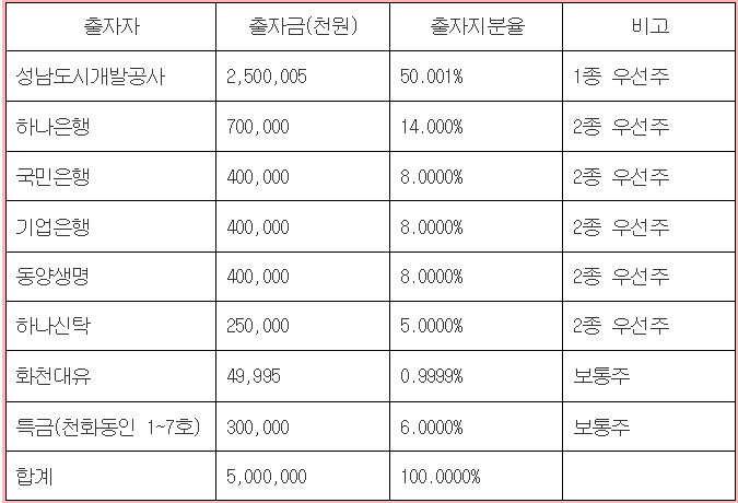 _______■ 지분율과 다른 배당, 그 이유는?대장동 개발을 둘러싼 의문은 공영 개발로 진행된 이 사업에서 민간이 어떻게 이렇게 많은 이익을 거둘 수 있었냐는 질문에서 시작됩니다.이 질문에 답하기 위해서는 우선 민간사업자인 ‘화천대유’와 그 관계사 ‘천화동인’이 ‘대박’을 거둘 수 있었던 ‘설계’를 살펴볼 필요가 있습니다. 성남도시개발공사와 화천대유가 참여한 ‘하나은행 컨소시엄’은 대장동 개발을 위해 회사를 하나 만듭니다. 특수목적법인(SPC)인 ‘성남의뜰’입니다. 특수목적법인은 말 그대로 특수한 목적을 위해 만들어진 일회성 법인을 의미합니다. 이번 경우에는 대장동 개발이 그 특수한 목적이죠.특수목적법인을 만드는 이유 중 하나는 특수목적에 해당하는 사업이 부실해졌을 경우 그 위험을 모기업이 지지 않기 위해서입니다. 가령 대장동 사업이 망했을 때 그 책임은 성남의뜰만 가지고 피해가 성남도시개발공사나 하나은행 등에 번지지 않게 하는 것이죠. 이렇게 만들어진 특수목적법인에서는 사업 참가자들이 돈을 어떻게 조달하고 또 어떻게 분배할지를 사업협약, 주주협약 등으로 정합니다.성남의뜰은 하나의 회사지만, 실제로는 여러 사업주체가 참여하는 셈이니 이들이 수익을 어떻게 나눌지 고민하는 것은 당연한 일입니다. 성남의뜰에 참여한 사업주체들의 지분율과 이들이 가진 권리의 성격(우선주, 보통주)은 아래 표와 같습니다.