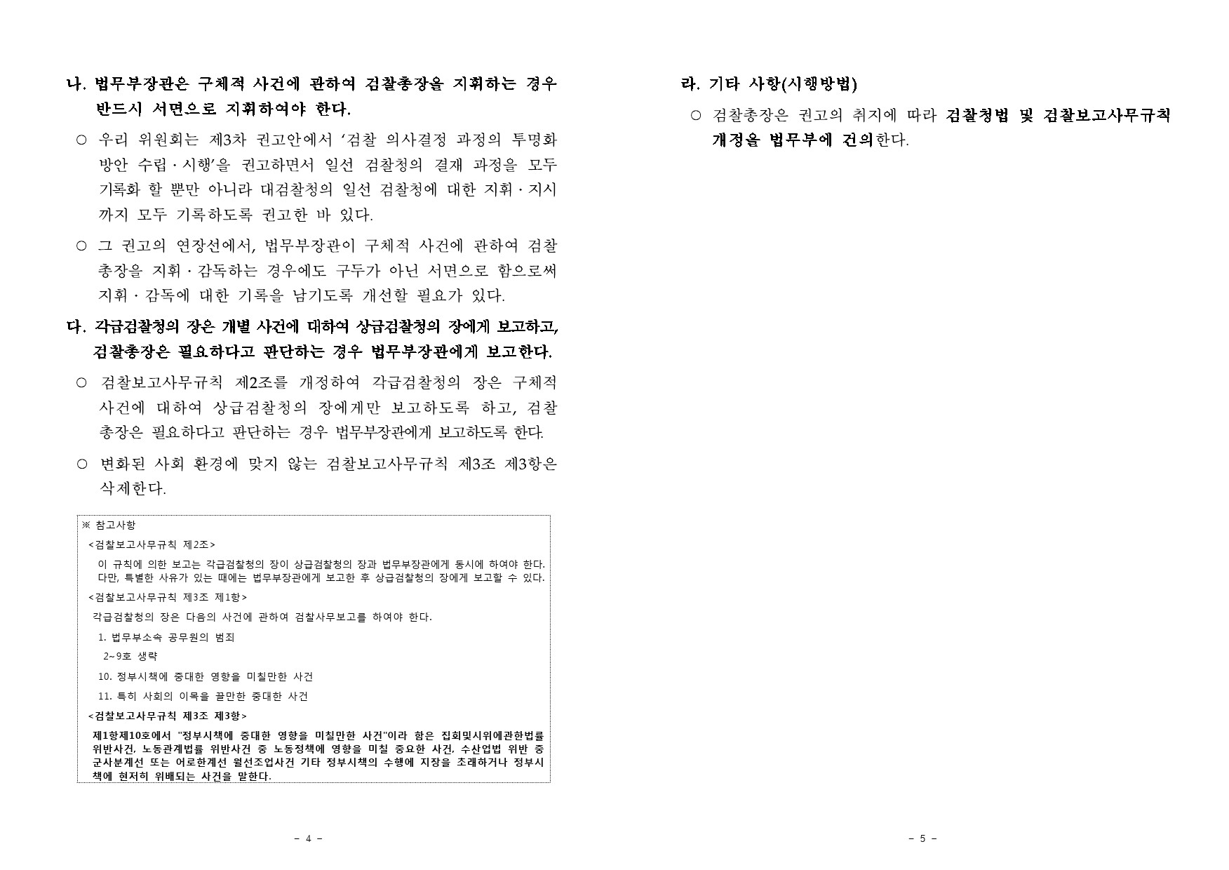 구체적으로는, ① 법무부장관은 구체적 사건에 대하여 반드시 서면으로 검찰 총장을 지휘하여야 하고, ② 각급검찰청의 장은 개별 사건에 대하여 검찰총장에게 보고하고, 검찰총장은 필요하다고 판단하는 경우 법무부장관에게 보고 하도록 권고했습니다.