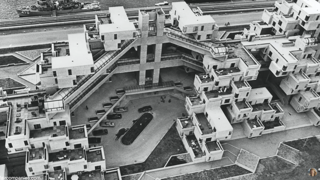 Safdie's breakthrough was that he realized by adding large terraces and wide laneways between units, an apartment complex could feel like a neighbourhood in the suburbs.