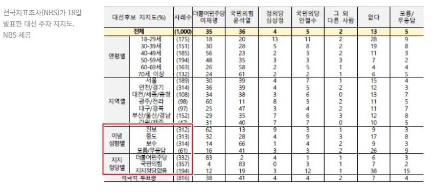 NBS 조사대상 '진보 312명, 중도 313명, 보수 314명. 상대적으로 균형.