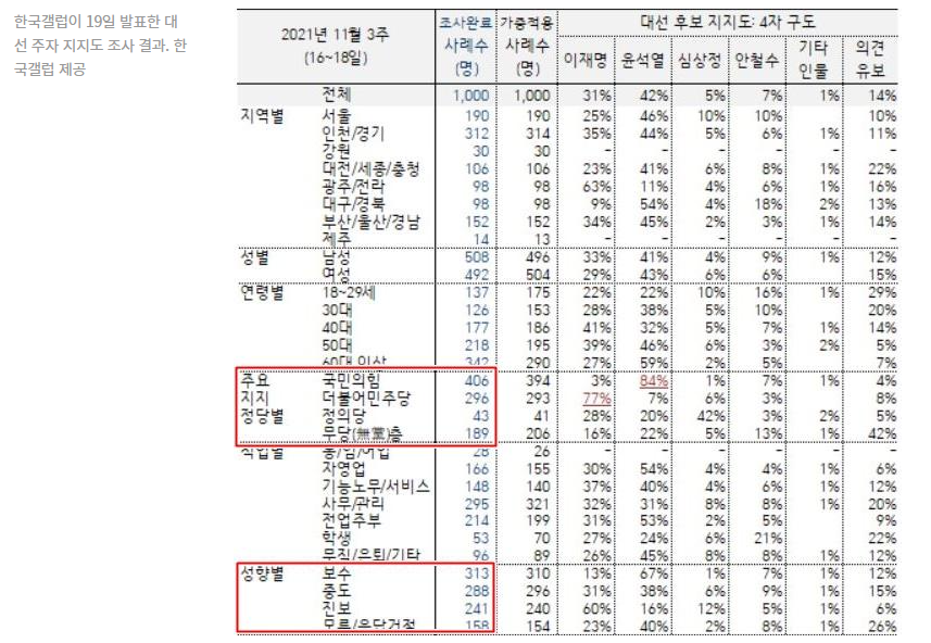 1. 조사 대상 '정치적 성향' 숫자 차이남. 갤럽 조사는 부정확한 편. NBS조사도 아직 확정적이지 않음.
