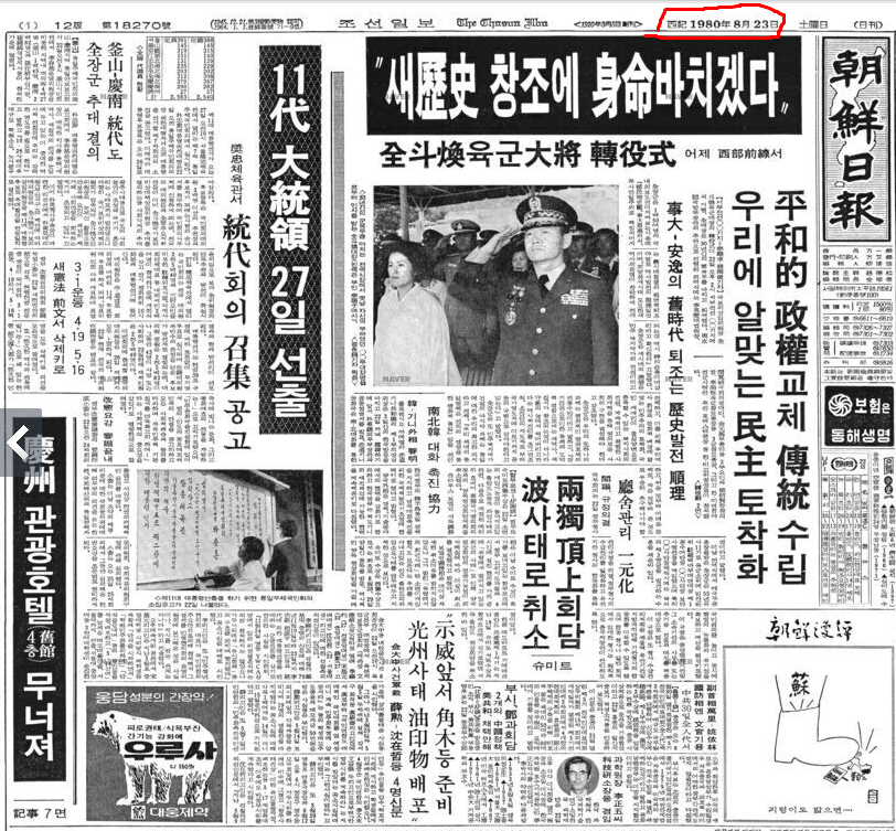 1980년 8월 23일. 조선일보 1면, "새 역사 창조에 신명 바치겠다 (전두환)" 실어.
