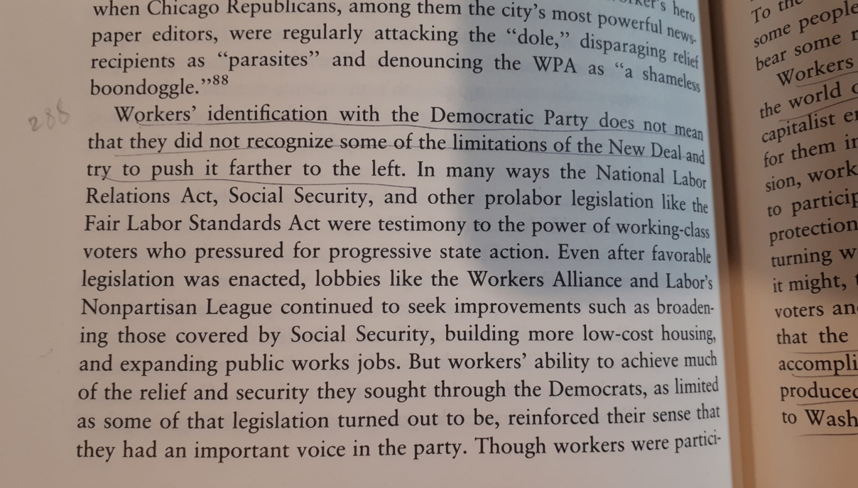 미국 민주당의 특질. 민주당은 노동자 정당이 아니었다. 민주당은 시카고 노동조합이나 노동자들을 위해 반자본주의적 노조 주장들을 정치적으로 밀어부치지 않았다. 루즈벨트 역시 노동자 계급이 정치권력을 장악하는 것에 찬성하지 않았고, 전통적인 파워 엘리트가 권력을 잡아야 한다고 생각했다. 이에 비해 노동자들은 미국의 부의 재분배를 통해 미국을 '도덕적인 자본주의'로 만들고자 했다.
