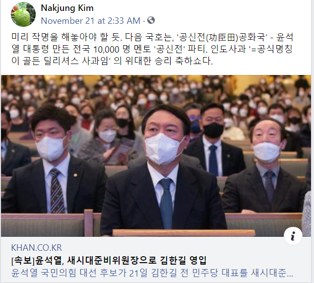 한국정치/국힘_한나라당_새누리당_자유한국당 윤석열의 1만명 멘토. '공신전(功臣田)공화국' - 윤석열 대통령 만든 전국 10,000 명 멘토 '공신전' 파티. by 원시 2021. 11. 29. 윤석열 인선 특징. 미리 작명을 해놓아야 할 듯. 다음 국호는, '공신전(功臣田)공화국' - 윤석열 대통령 만든 전국 10,000 명 멘토 '공신전' 파티. 인도사과 '=공식명칭이 골든 딜리셔스 사과임' 의 위대한 승리 축하쇼다. 공유하기 게시글 관리 한국정치 노트 Notes on the Politics of Korea 저작자표시 변경금지 (새창열림) '한국정치 > 국힘_한나라당_새누리당_자유한국당' 카테고리의 다른 글 검찰, ‘스폰서 의혹’ 윤우진 전 세무서장 구속영장 청구 (0) 2021.12.04 대선 보도, 언론은 공정하고 정직한가? 중앙일보와 jtbc의 경우. 윤석열 대통령 당선처럼 중앙일보 1면. 정책이 국민행복에 미칠 영향력은 전혀 관심없음. 중계료만 챙기는 홍석현. (0) 2021.12.04 [jtbc 이준석 인터뷰] 이준석을 몰아낸 윤핵관, '한명회' 놀이. 수양대군이 단종 대하듯이. 준석 애사 (哀史) 냐, 이준석의 삼별초 항전이냐 (0) 2021.12.02 윤석열 지지율 정체 이유.윤석열 보호자들이 그를 '미숙한 세자'로 만들고 있다. 강화도령,철종같은 윤석열 (0) 2021.11.26 '전두환 정치는 잘 했지 않냐' 발언해서 당내 경선 승리한 윤석열. 전통 보수중핵층(60대~80대) 대구경북 국힘당원 표받아 홍준표 물리친 윤석열, 전두환 '조문 간다' - 제대로 된 '진실규명과 .. (0) 2021.11.23 김병준 "윤석열, 뇌물 전과자 김종인과 손 잡겠나" (0) 2021.11.22 (1)윤석열 Paris' castle 선본. (2)진중권교수가 '합리적 김종인표 국밥'을 주문, 주방장이 내놓은 건 '한길표 김김 잡탕밥'. (3) '탈이념' '진영논리에 빠졌다' '상식정치' 등 단어 오용을 바로잡자. (1) 2021.11.20 관련글 대선 보도, 언론은 공정하고 정직한가? 중앙일보와 jtbc의 경우. 윤석열 대통령 당선처럼 중앙일보 1면. 정책이 국민행복에 미칠 영향력은 전혀 관심없음. 중계료만 챙기는 홍석현. [jtbc 이준석 인터뷰] 이준석을 몰아낸 윤핵관, '한명회' 놀이. 수양대군이 단종 대하듯이. 준석 애사 (哀史) 냐, 이준석의 삼별초 항전이냐 윤석열 지지율 정체 이유.윤석열 보호자들이 그를 '미숙한 세자'로 만들고 있다. 강화도령,철종같은 윤석열 '전두환 정치는 잘 했지 않냐' 발언해서 당내 경선 승리한 윤석열. 전통 보수중핵층(60대~80대) 대구경북 국힘당원 표받아 홍준표 물리친 윤석열, 전두환 '조문 간다' - 제대로 된 '진실규명과 ..