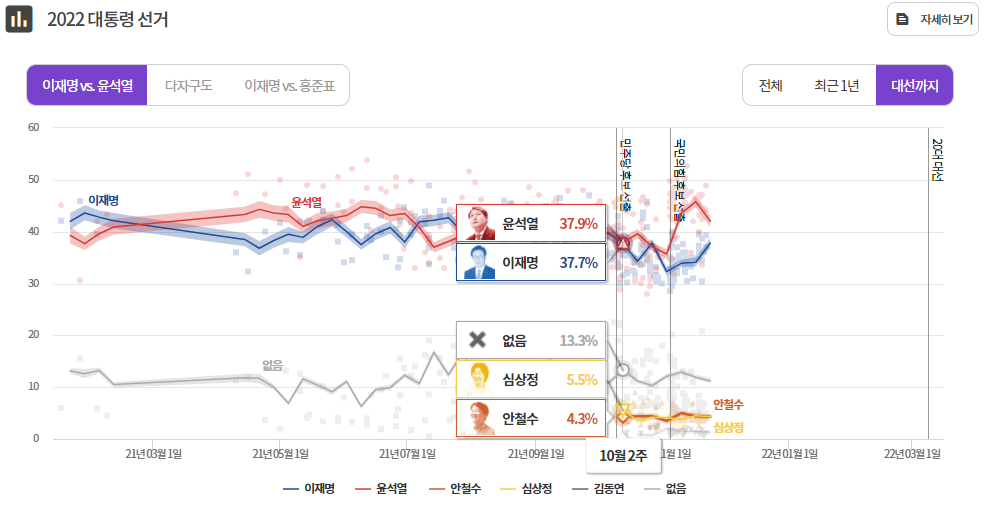 거의 차이가 없다. 민주당과 국민의힘 전통적인 중핵층 결집도만 강해진 형국이다.