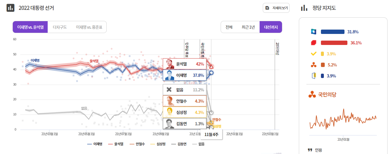 윤석열 42% (국민의힘 정당 지지율 36.1%)