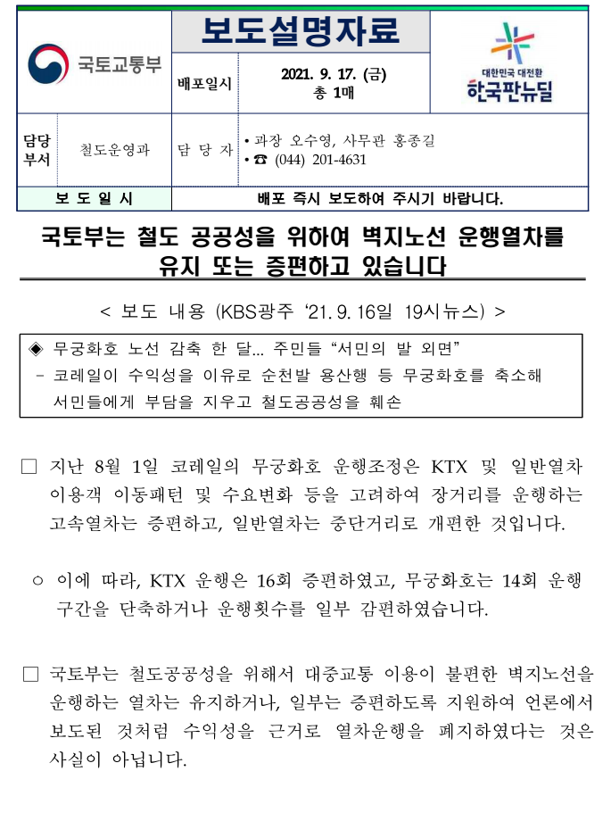 □ 국토부는 철도공공성을 위해서 대중교통 이용이 불편한 벽지노선을 운행하는 열차는 유지하거나, 일부는 증편하도록 지원하여 언론에서 보도된 것처럼 수익성을 근거로 열차운행을 폐지하였다는 것은 사실이 아닙니다.