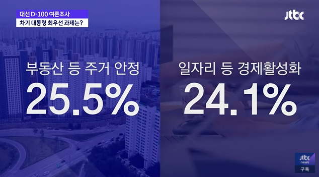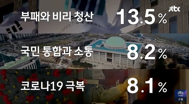 [조사 1] 대선 핵심 주제들 여론조사 1위 집값, 부동산 등 '주거권' 26% 2. 노동소득 관련 '일자리 안정' 24%,부패와 비리 청산 13.5%, 국민 통합과 소통 8.2%, 코로나 19 극복 8.1% 등임.