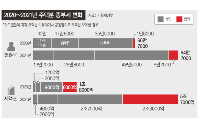 하지만 종부세 대상자가 여전히 전국민의 2%에 불과하고, 고가주택 소유자와 다주택자를 중심으로 집값 급등에 따른 자산 가치 상승 폭이 상당했다는 점을 고려하면 이들의 반발은 지나치다는 반론이 만만치 않다. 정부가 지난해 8월 종부세율 인상안을 발표해 다주택자들이 집을 팔 시간을 줬다는 점, 1세대 1주택자 종부세 부과 기준선이 공시가격 9억원에서 11억원으로 상향되고 고령·장기보유 공제가 확대돼 상당수 1주택자가 종부세 대상에서 제외되거나 전년보다 세액이 줄었다는 점 등도 함께 봐야한다는 지적이 나온다.