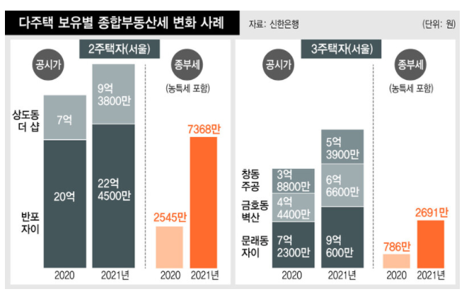 종부세 대상 다주택자는 올해 48만5천명으로 지난해에 비해 13만명 늘었다. 세액도 2조7천억원으로 전년(9천억원)보다 3배 늘었다. 신한은행 부동산투자자문센터에 따르면, 서울 반포 자이아파트(84㎡)와 상도동 더샾아파트(84㎡)를 보유한 2주택자는 종부세(농특세 포함) 부담이 지난해 2545만원에서 올해 7368만원으로 3배 가까이 늘어났다. 공시가격은 두 아파트 모두 각각 2억원 넘게 올라, 호가로 계산하면 1년 만에 10억원 가까이 자산 가치가 불어난 셈이다. 서울 창동 주공아파트(85㎡)와 금호동 벽산아파트(86㎡), 문래동 문래자이아파트(115㎡) 등 3채를 보유한 경우엔 종부세액이 지난해 786만원에서 올해 2691만원으로 증가했다. 1년 새 공시가격도 각각 2억원가량씩 올랐다.