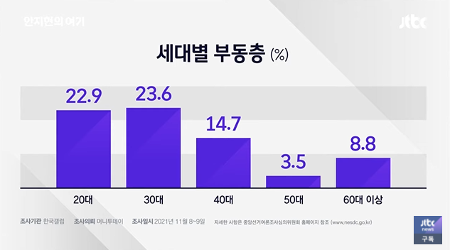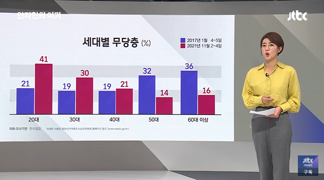 과거 19대 대선을 지금처럼 꼭 넉 달 남긴 시점을 돌아보면 당시 2030세대 무당층은 각각 21%와 19%에 불과했고요.