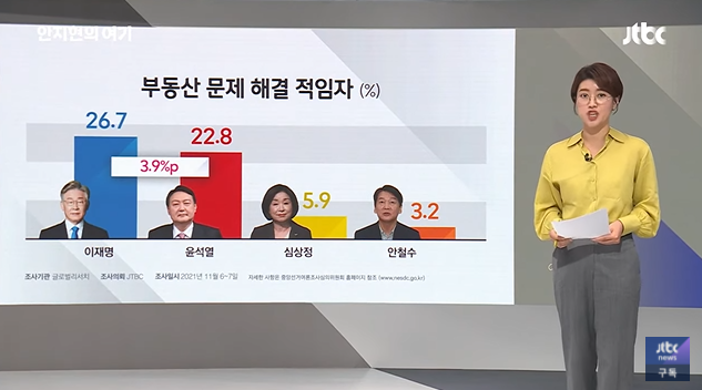 저희 JTBC와 글로벌리서치의 여론조사 결과를 보면 부동산 문제 해결 적임자가 누구냐 이렇게 물었더니 이재명 26.7%, 윤석열 22.8%로 두 사람 격차는 3.9%포인트 차, 오차범위 내로 비슷했습니다.