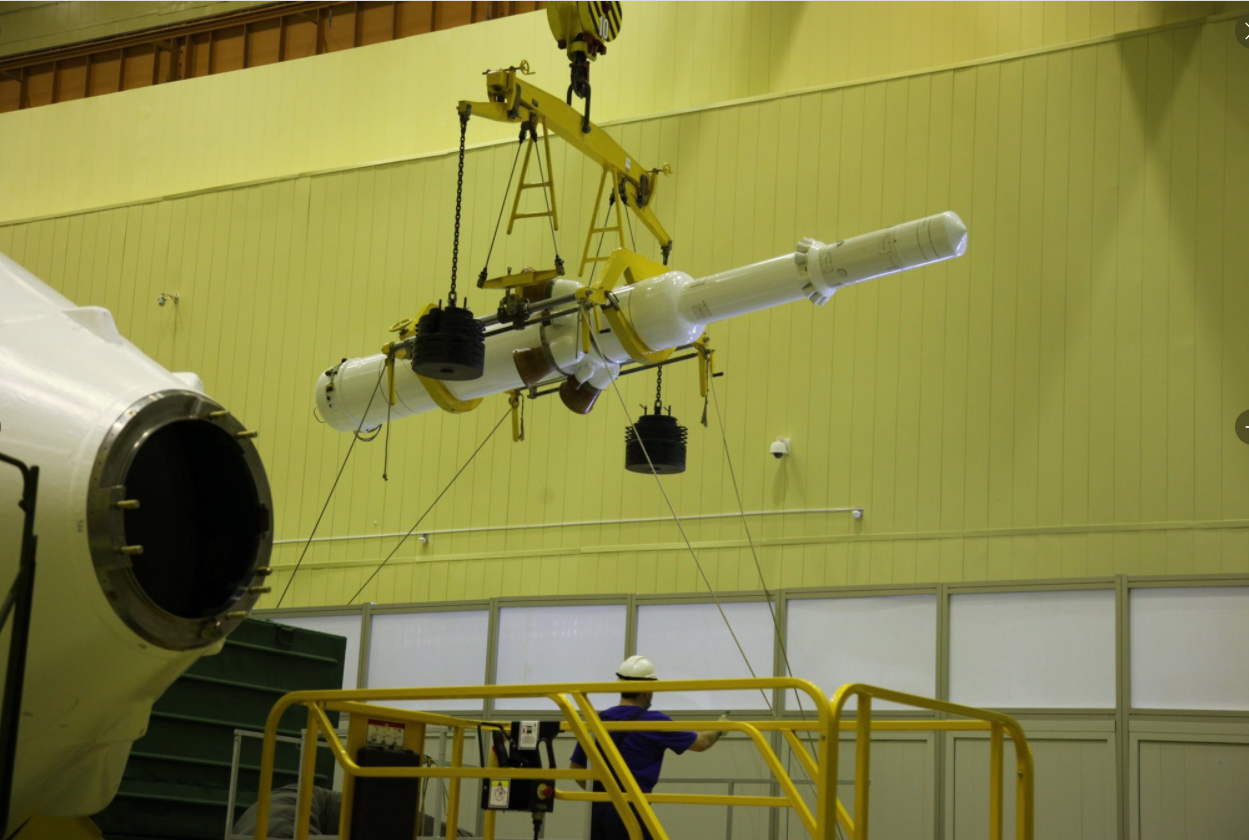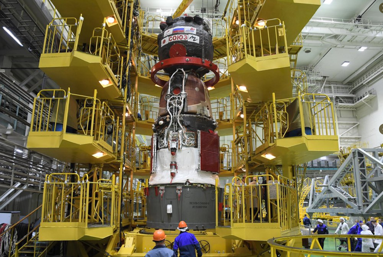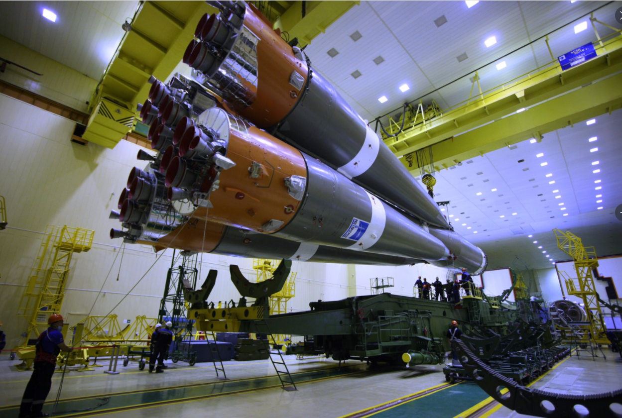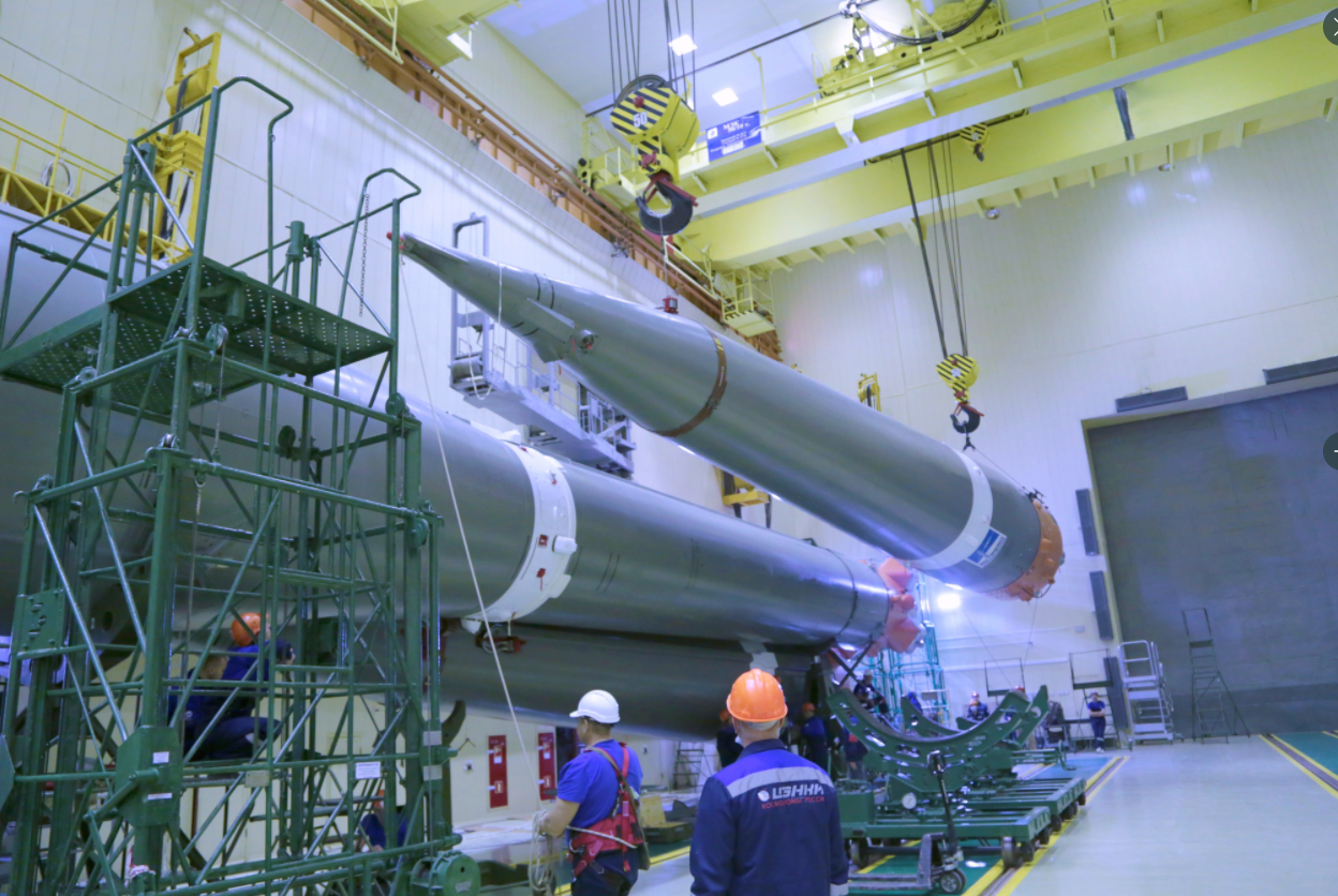 Assembling the Soyuz rocket. Seeing it, I realize that the launch is so soon. Total length of the rocket is 50m.