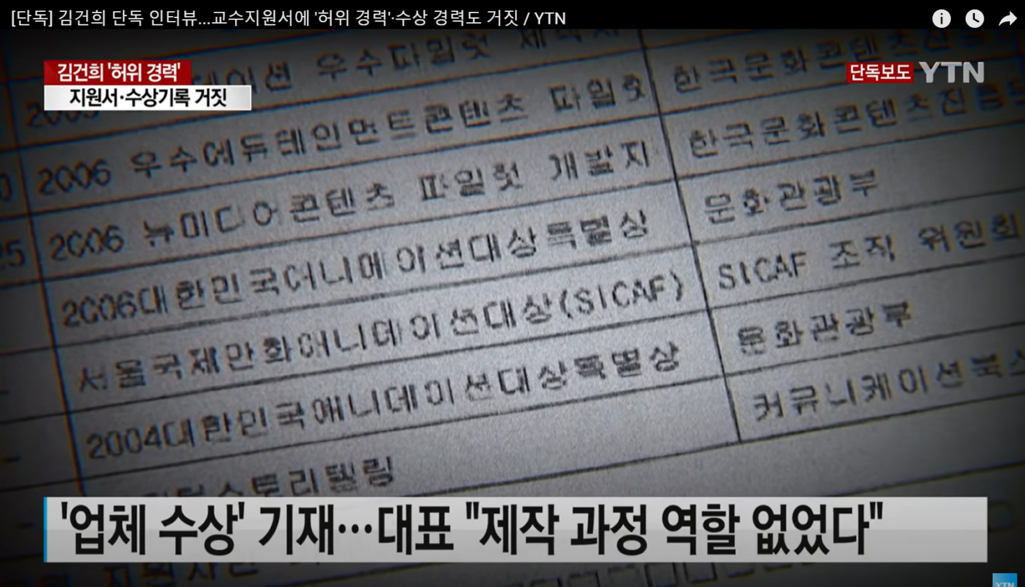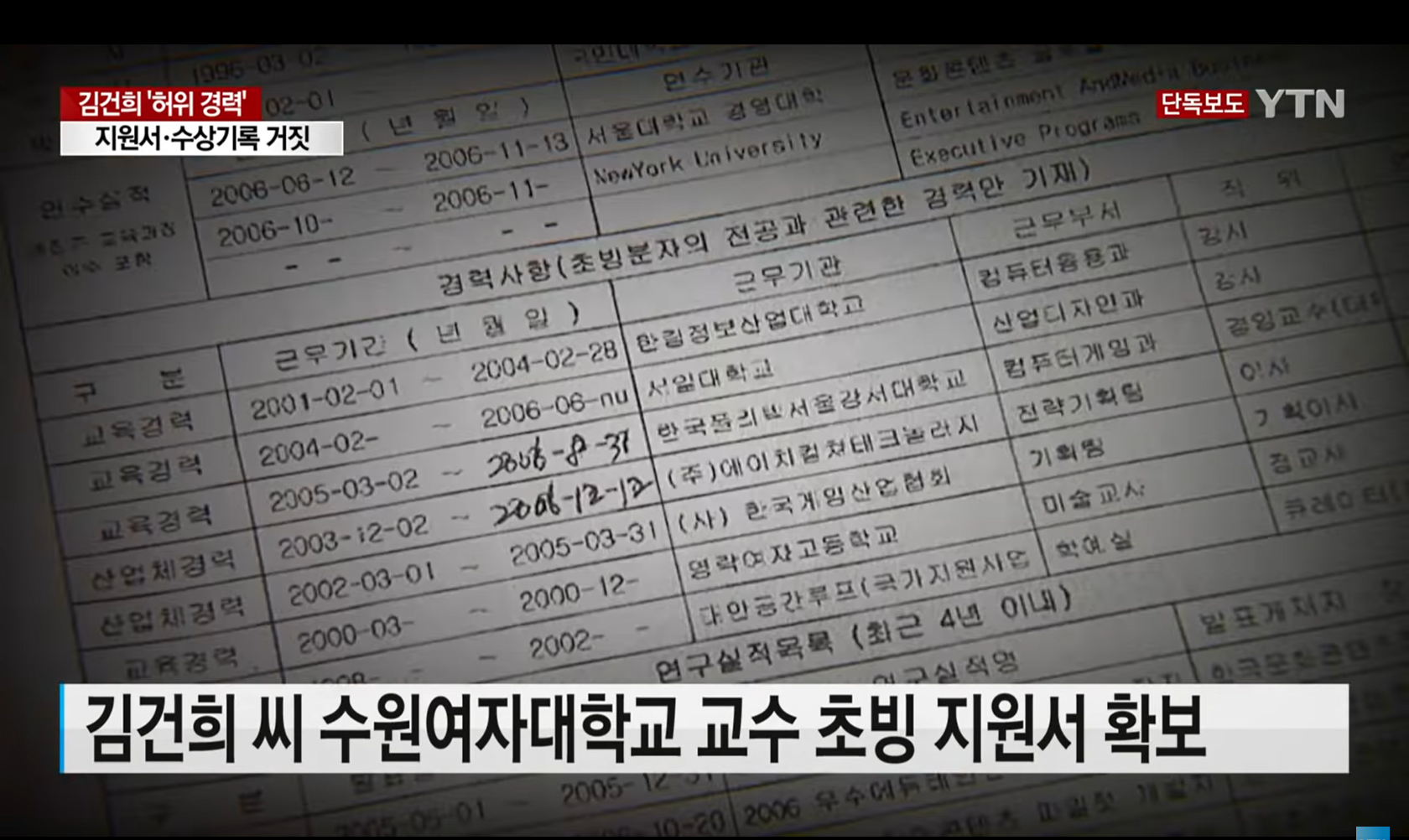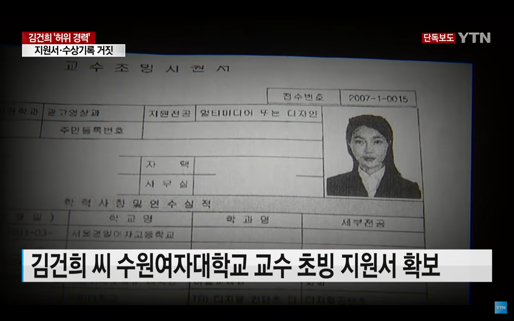 윤석열 국민의힘 대선후보의 부인 김건희 씨가 과거, 대학에 제출한 교수 임용 지원서에 허위 경력과 가짜 수상 기록이 기재된 사실이 YTN 취재 결과 확인됐습니다.