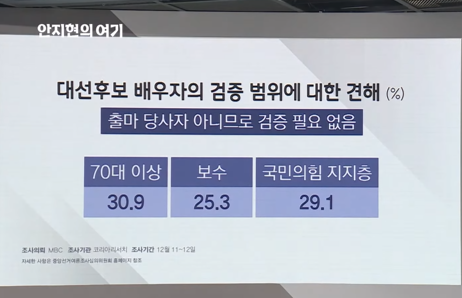 70대 이상이 30.9%, 보수층이 25.3%, 국민의힘 지지층 29.1%로 가장 많음. 이들이 '개인 공간과 프라이버시'존중이라는 이유로, 김건희 검증불필요성을 주장하는 것은 아니다. 마치 조국 사태 당시 조국가족의 인권을 검찰이 파괴하고 있고, 잔인무도하다고 비난하던 세력과 동일한 주장임. 민주당 조국 사태와 정반대 현상임.