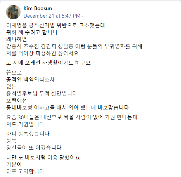 이어 내년에 치뤄질 대선에 기권하겠다고 선언하면서 “요즘 30대들은 대선후보 찍을 사람이 없어 기권한다는데 저도 기권이다. 아니 항복했다. 당신들이 또 이겼다. 나만 또 바보처럼 이용당했다. 기분이 아주 고약하다”고 심경을 전했다.