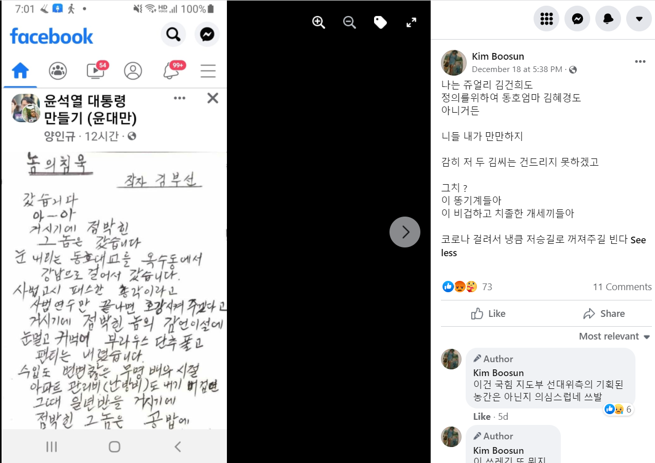 김씨는 해당 글과 함께 게재한 영상에서 윤 후보의 극성 지지자들과 국민의힘 측을 향해 “내가 윤석열 각시냐. 내가 이재명 각시냐. 국힘의 최고 여성 의원들, 당신들 잘 생각해보라. ‘쥴리’ 벽화 그려졌을 때, 김부선 포스터 그려졌을 때 누구 한 사람 쉴드쳐 준 사람 있었냐. 이렇게 무고한 여배우가 인권 탄압을 당할 때 당신들 다 즐기기만 했다. 내가 페인트 사서 뿌리고 온 사람이다”라고 언성을 높였다.
