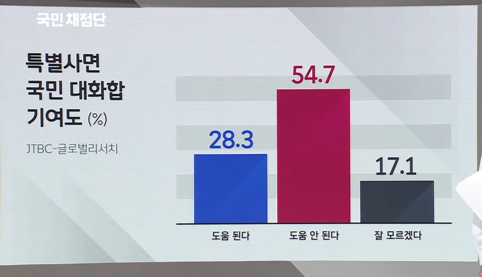 박근혜 특별사면 여론조사, 국민대화합(통합)에 기여하지 못했다 54.7%로 기여했다 28.3%보다 훨씬 더 많았다.