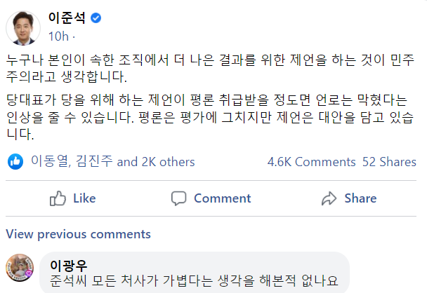 이준석 "평론은 평가에 그치지만 제언은 대안 담고 있다. 누구나 조직 발전을 위해 제언하는 게 민주주의다"