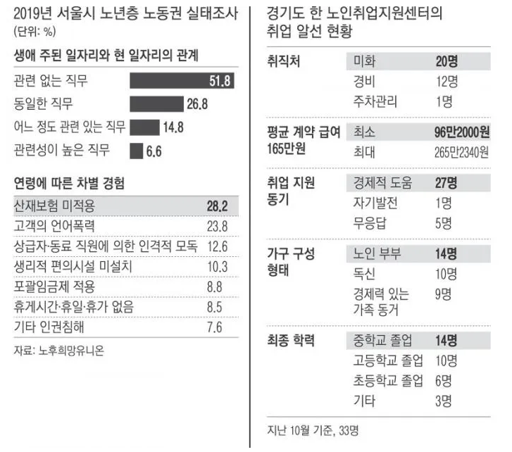 경기도의 한 노인취업지원센터에서 지난 10월 취업을 알선한 노인 33명이 젊은 시절 10년 이상 했던 일들이다. 한 분야에서 오랫동안 열심히 일했지만, 노인이 돼 일자리를 구하려면 이 같은 경력은 소용이 없다. 도시에서 노인이 할 수 있는 일은 청소나 경비 같은 단순노무직으로 제한돼 있다. 기업들이 노인 노동자를 원하지 않기 때문이다.
