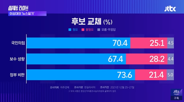 문재인 정부 비판층에서, 윤석열 후보 교체 필요 73.6%, 불필요가 21.4%로,