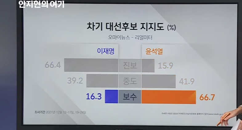 진보, 중도, 보수에서 보수의 계층에서 윤 후보에 대한 지지율 가장 많이 빠졌는데요.