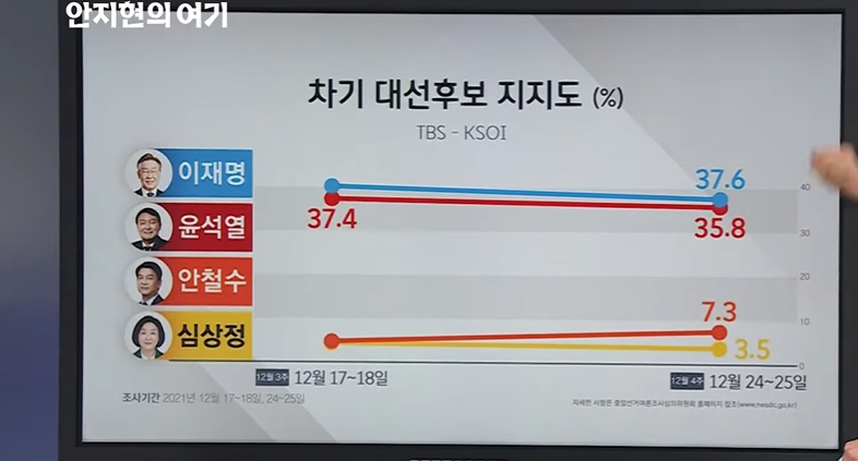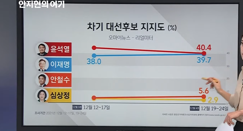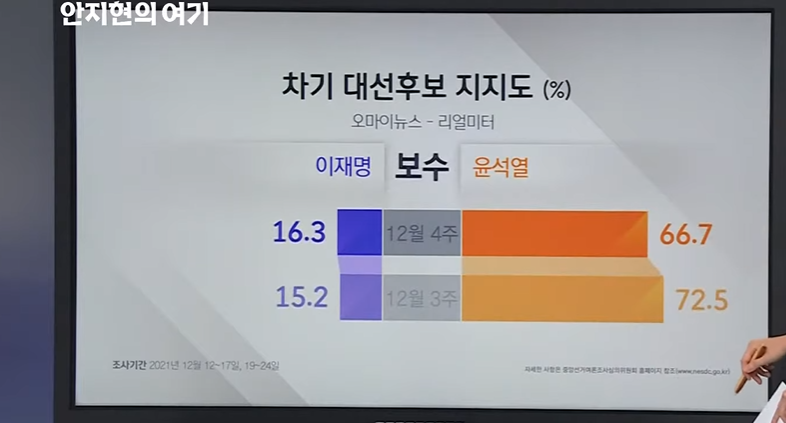 11월 19일 여론조사 발표에서, 비호감도, 안철수 (68%), 이재명 (63%), 심상정 (60%), 윤석열 (56%) 순서였는데, 12월 30일 경우, 안철수는 좀 줄어들고, 윤석열은 더 늘어나고, 이재명과 심상정의 경우 그대로일 것이다.
