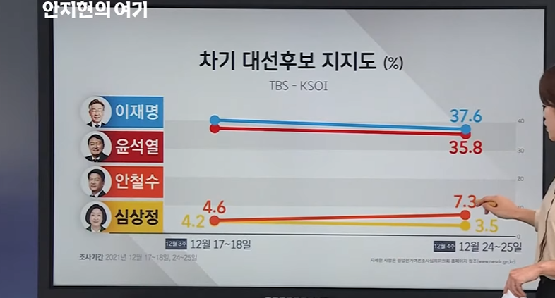 이것도 한번 추이로 살펴보면 TBS와 KSOI 조사인데 보시는 것처럼 이 주황색 흐름이 안철수 후보의 추이인데요.