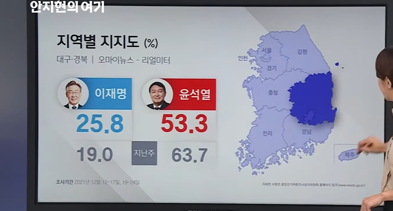 강원지역을 제외하면 대구, 경북지역에서 윤 후보에 대한 지지율 가장 많이 빠졌는데요.