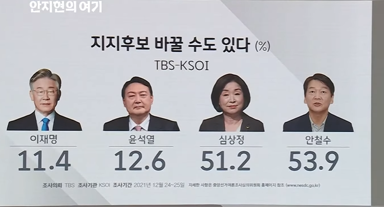 지지후보 바꿀 수 있다. 심상정 51.2%, 안철수 53.9%, 이재명 11.4%, 윤석열 12.6%이다.