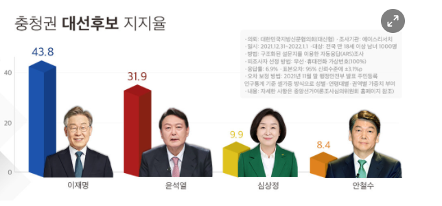 충청투데이-대한민국지방신문협의회 1차 공동 여론조사 결과(지난달 31일부터 1일까지 2일간 전국에 거주하는 만 18세 이상 성인 남녀 1000명 대상)에 따르면 대전·충청·세종(이하 충청권) 대선후보 지지도에서 이재명 후보(43.8%)와 윤석열 후보(31.9%)간 격차는 11.9%p 차이로 오차범위를 벗어나 앞서는 것으로 나타났다.(오차범위는 95% 신뢰수준에 ±3.1%p, 자세한 내용은 중앙여론조사심의위원회 홈페이지 참고)