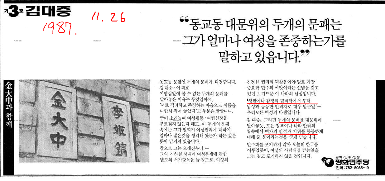 문패의 경우. 1987년 대선 선거운동. 문패 2개 달아도, 정치적 페미니스트인 시절. 미국유학 후 이희호씨의 정치적 행보는 김대중에 비해 상대적으로 적게 알려졌다. 대통령 당선 이후 김대중의 가족 비리 의혹은 불거졌었지만.