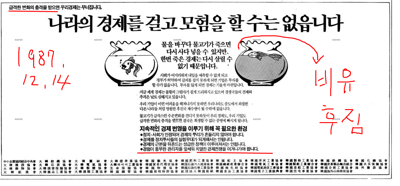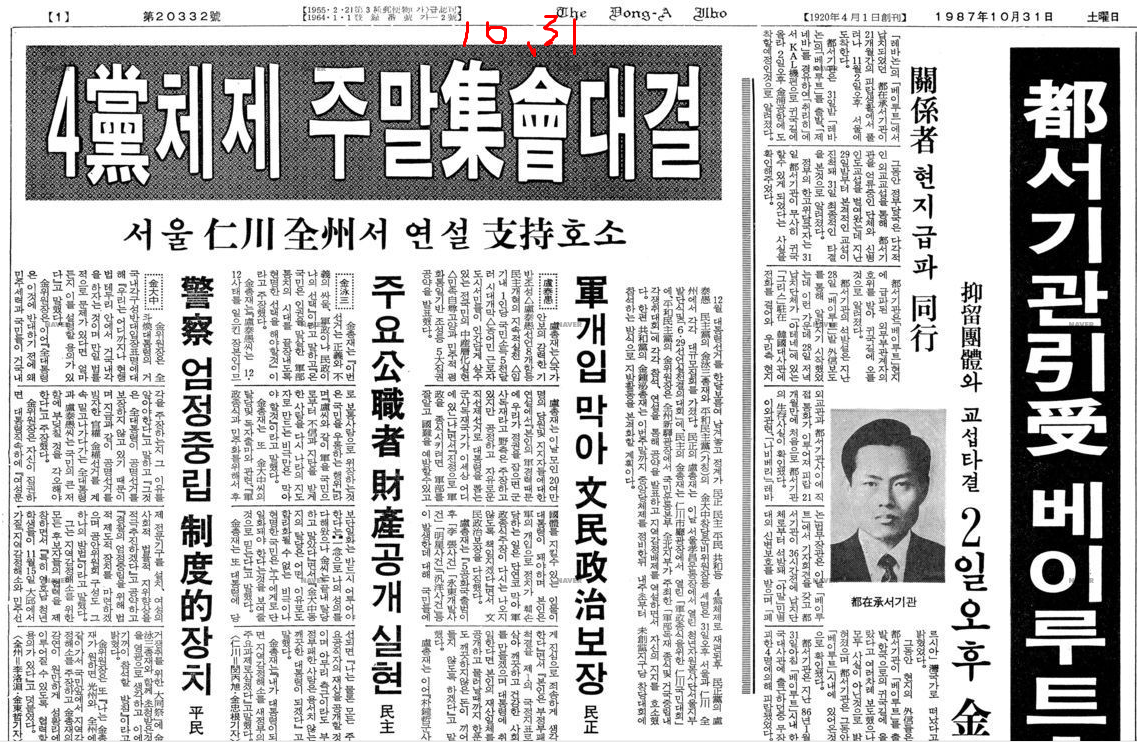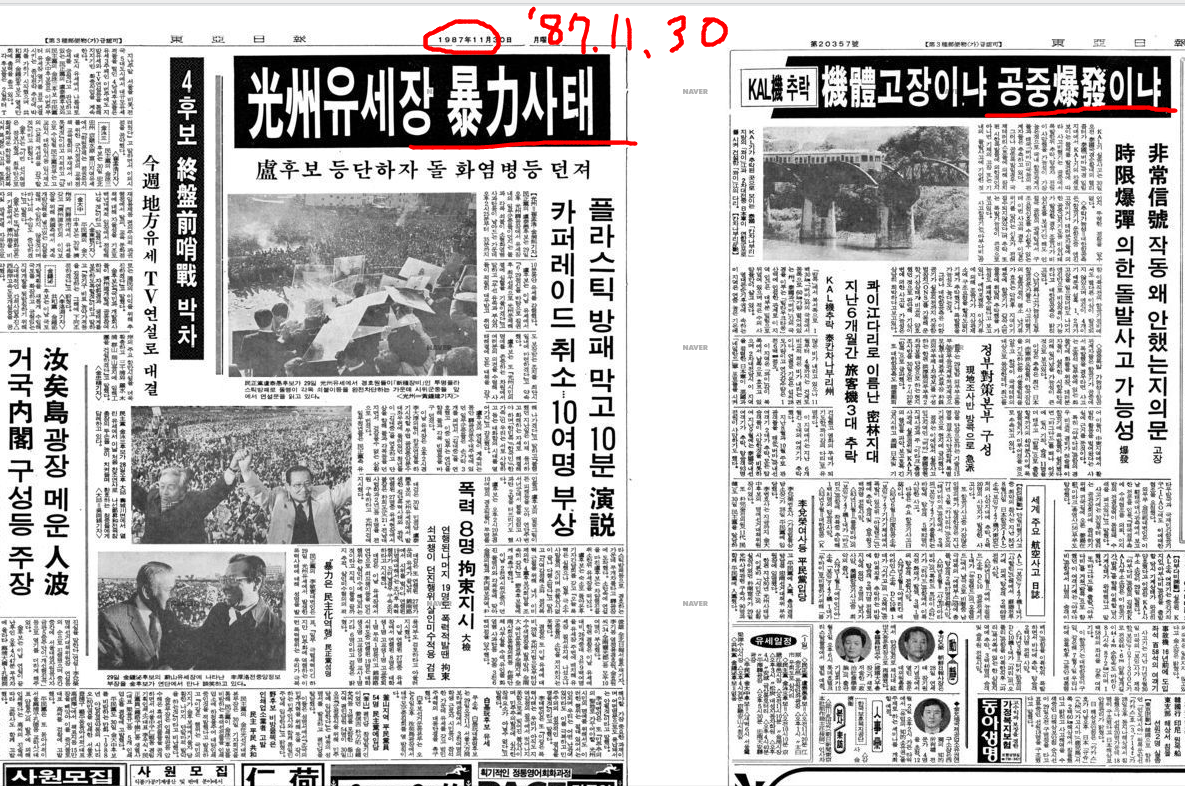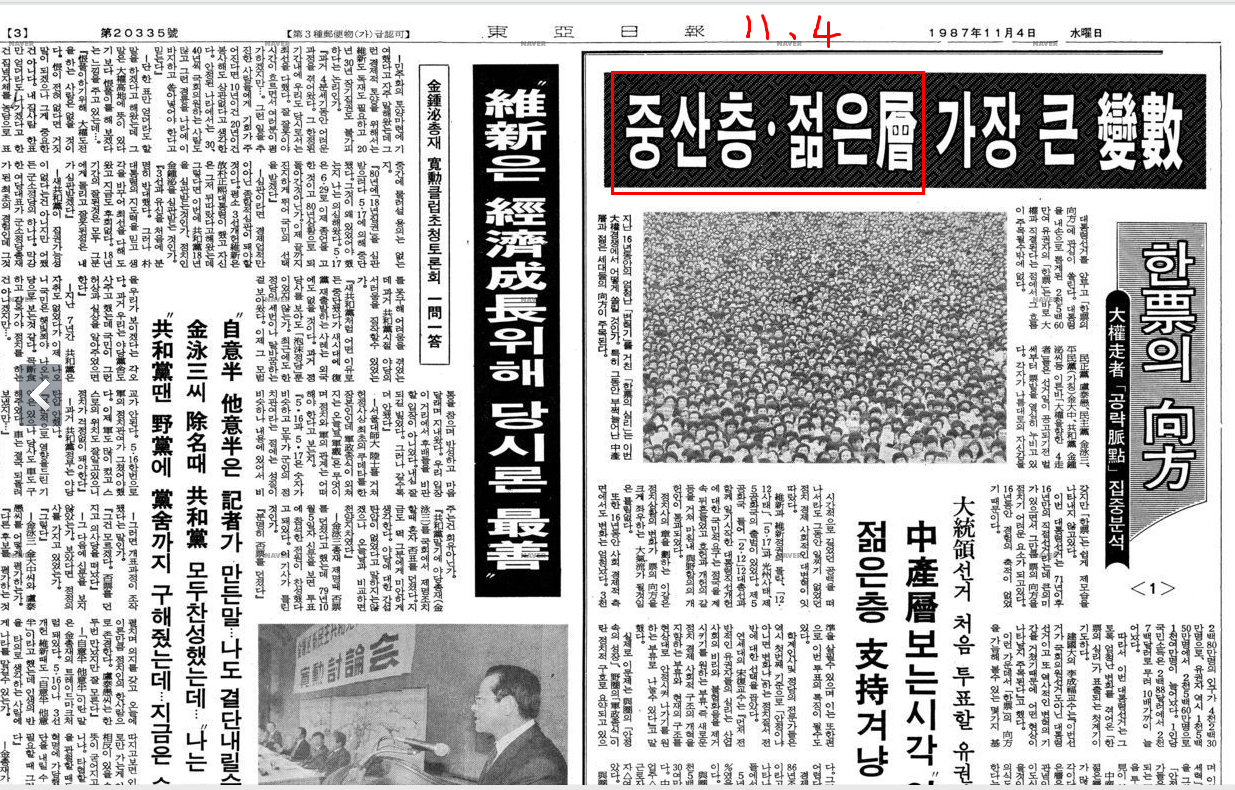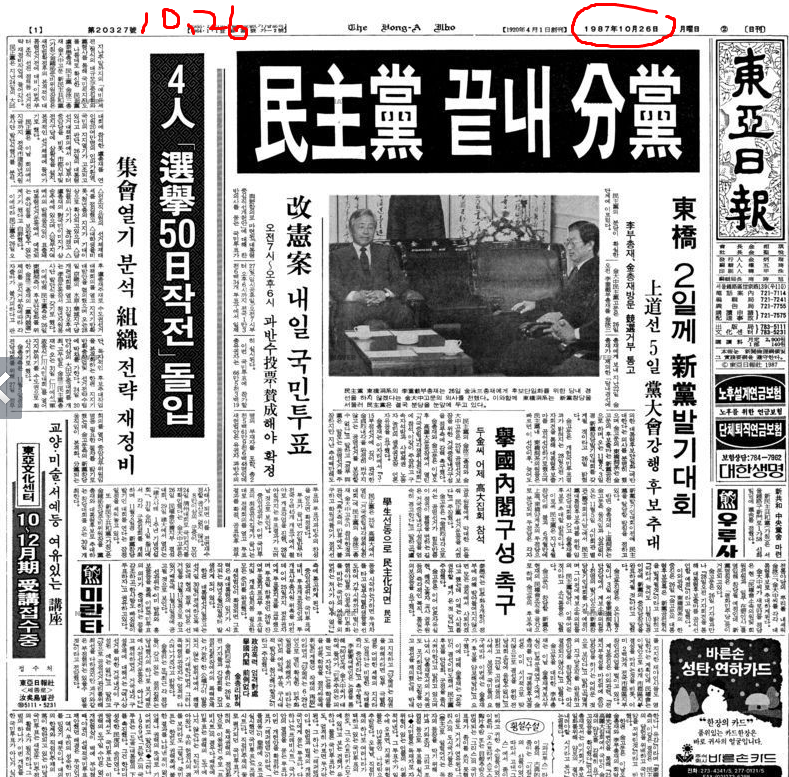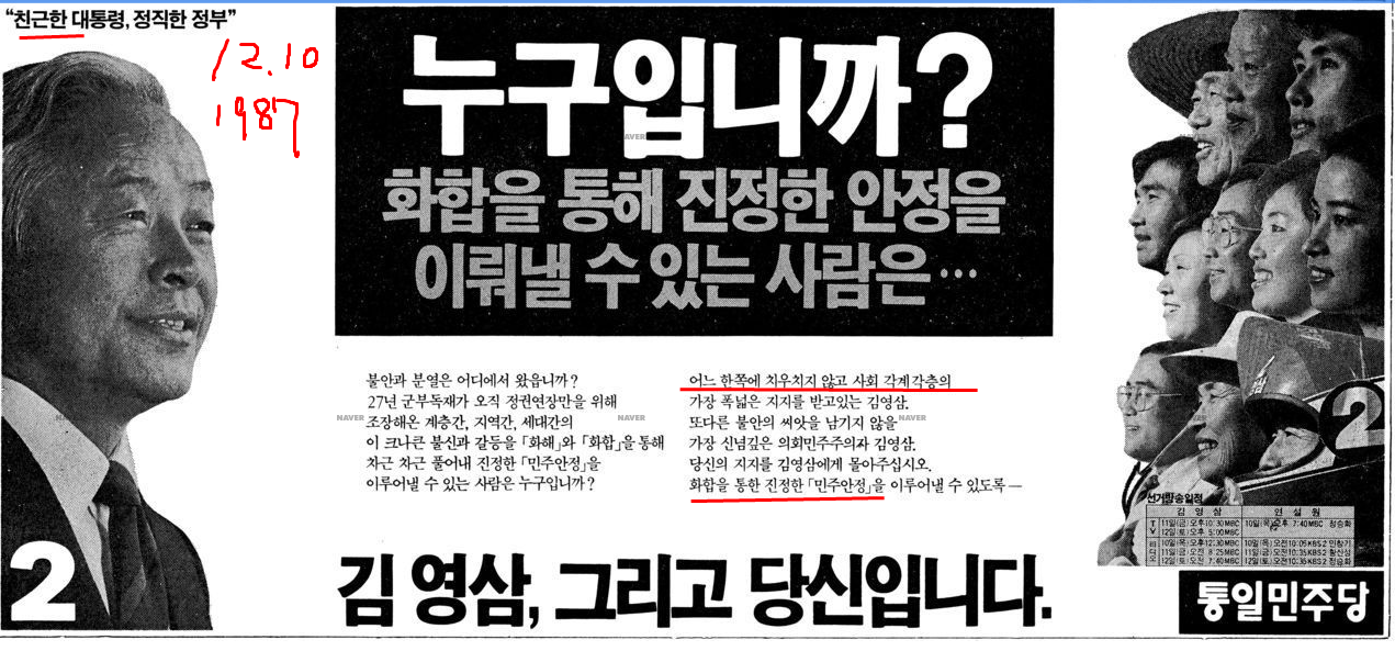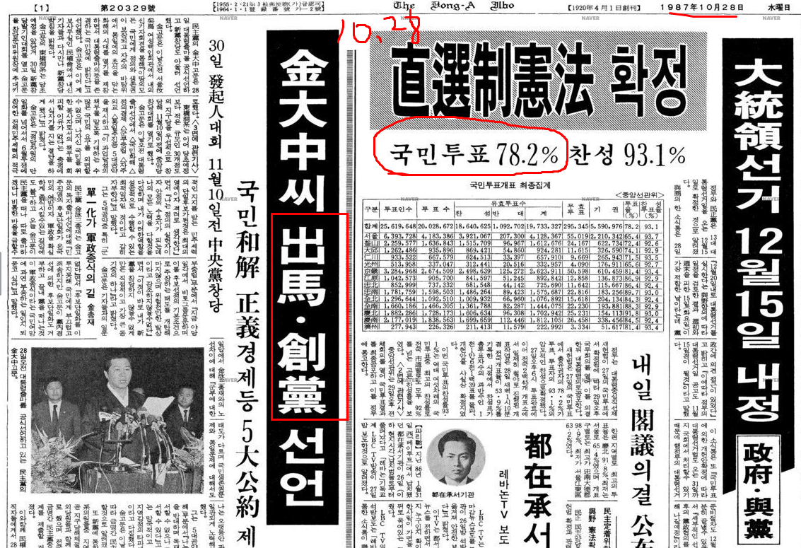 1987년 김영삼-김대중 분열, '결선투표' 누락된 '제 6공화국 헌법', 이런 중대한 오류 속에서도, 두 김씨의 정책대결이 크게 부각되지 않았지만, 1988년 봄 총선에 여소야대 국면을 만들어낸 기초는 되었다.