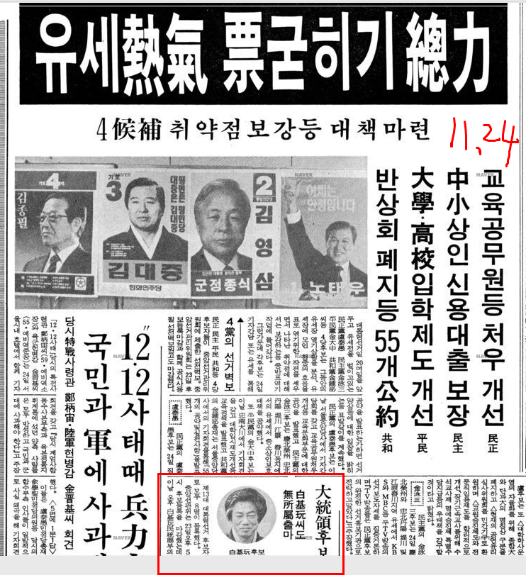 1987년 10월부터 12월 16일 대선까지, 김대중, 김영삼, 김종필, 노태우, 민중후보 백기완 등 재야 흐름.