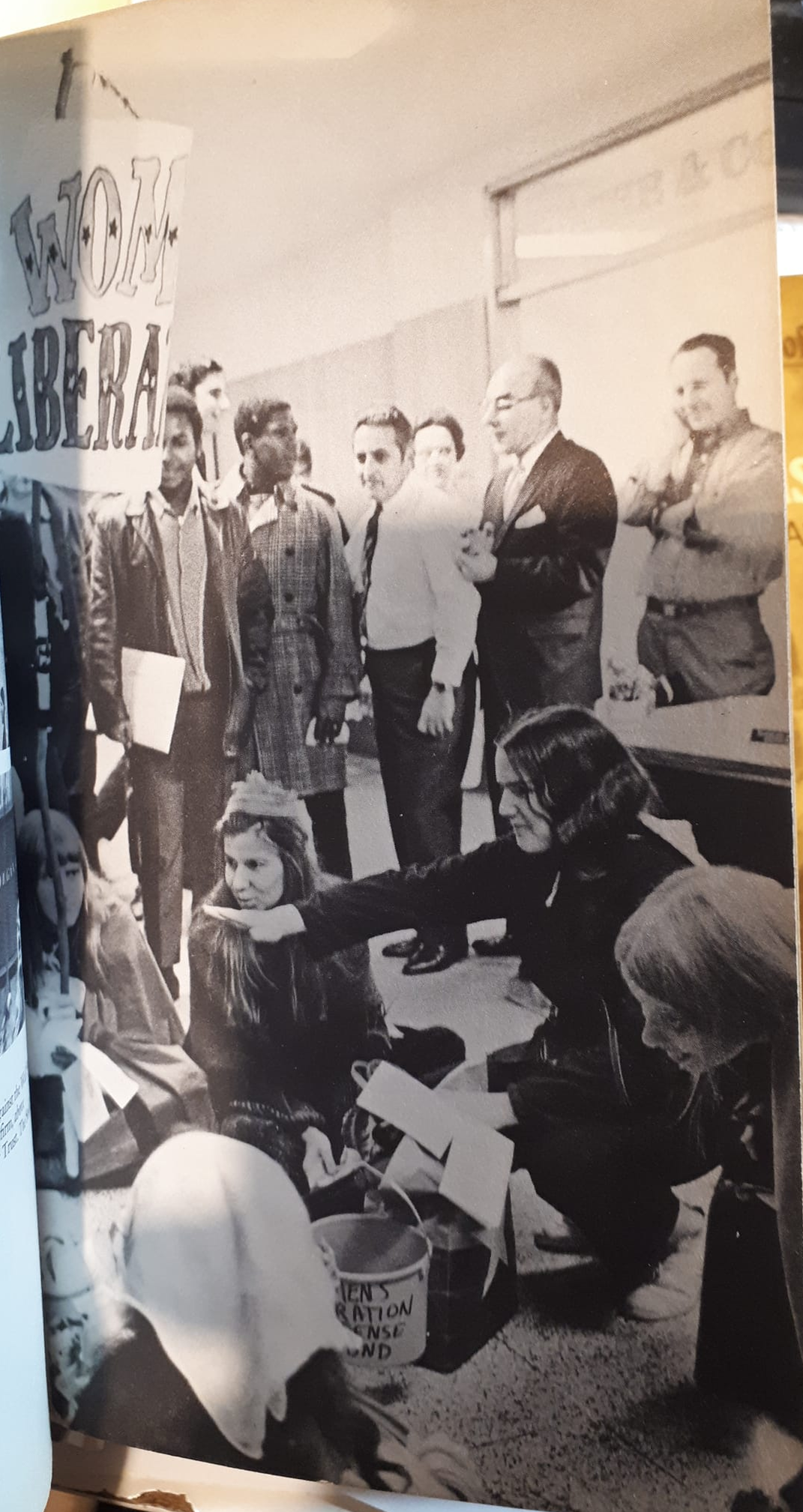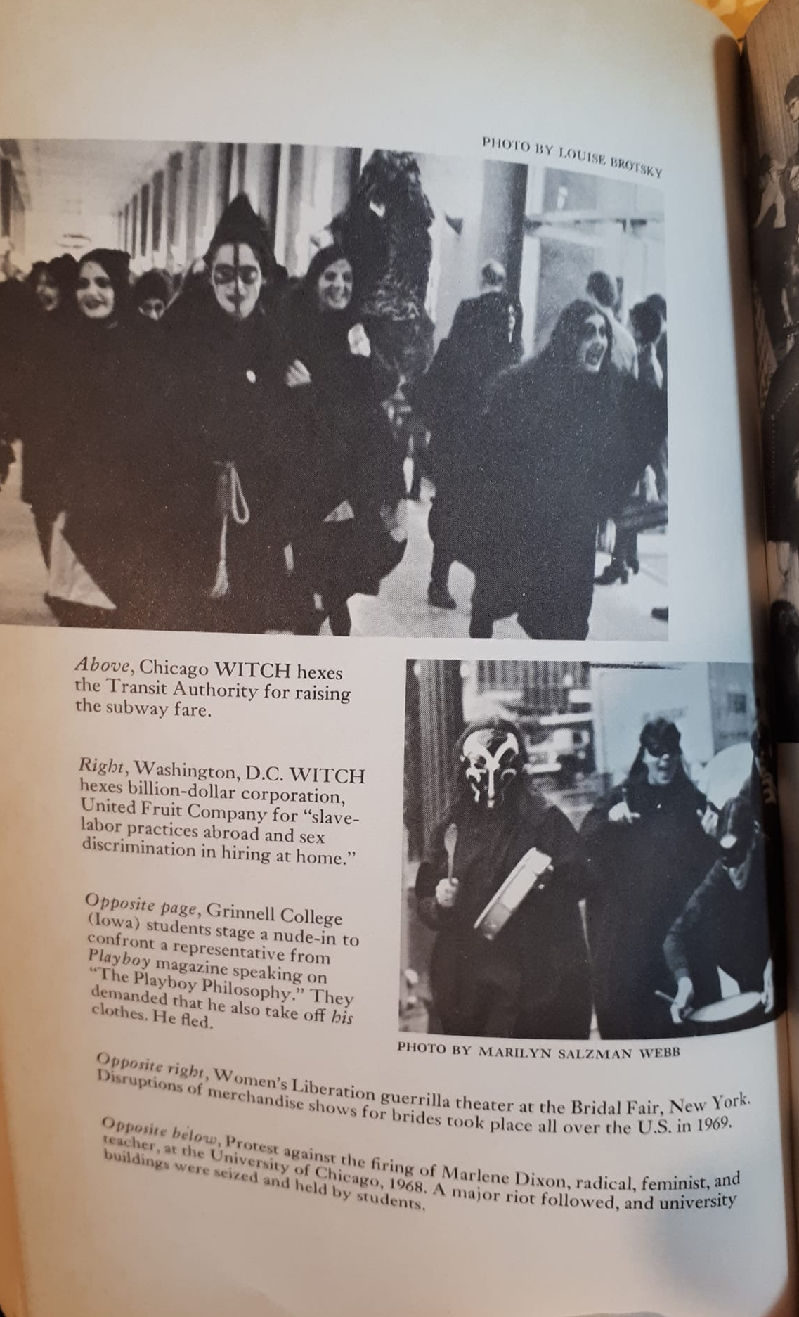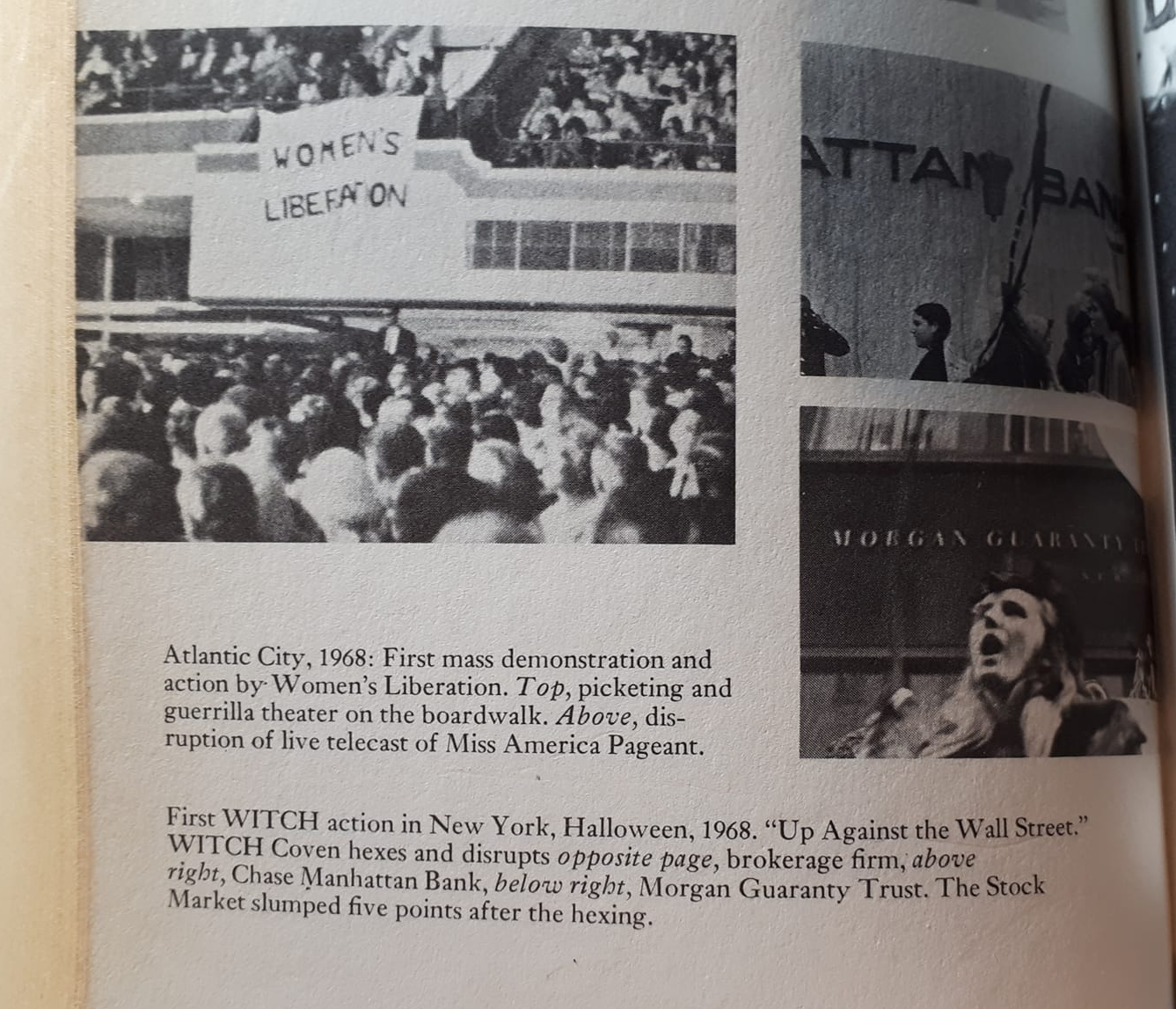 (위 오른쪽, 1968년 뉴욕에서 최초, 여성해방운동 시위인 "마녀 행동 Witch Action" 장면, 금융자본 "월 스트리트에 저항하라 Up Against the Wall Street"를 외치며, 체이스 맨하탄 은행에서 시위.
