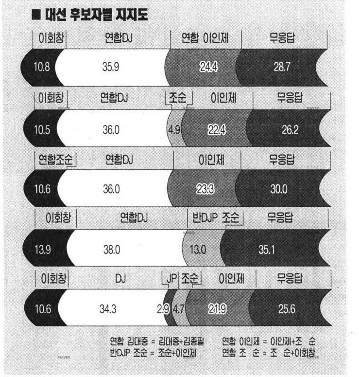 김대중-김종필 연합팀, 이회창(신한국당)과 조순(민주당) 연합팀, 과거 통일민주당의 부활을 꿈꿨던 이인제 (국민신당+김영삼의 정신적 후원)팀으로 나뉘어졌다.